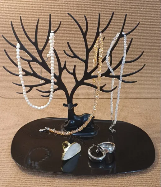 Антонина: «Прикольно смотрится в интерьере. Слегка великоват, думала, что займет меньше места, у меня столик маленький. Мне удобно вешать на рога оленя кольца и часы, которые надеваю ежедневно. Не приходится каждый день мыть, высушивать их и класть в шкатулку. В принципе можно брать».