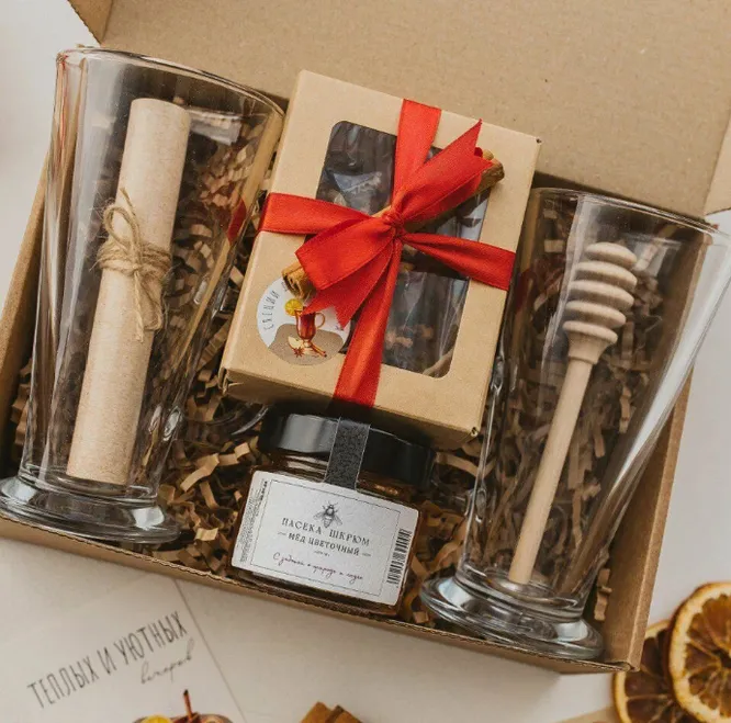 Оксана: «Подарок выглядит очень атмосферно и презентабельно. Плюс продавец положил крафтовый пакет для удобства. Сами бокалы, коробочка со специями для глинтвейна и баночка меда. Открываешь и сразу чувствуешь праздник. Получился очень вкусный глинтвейн))».