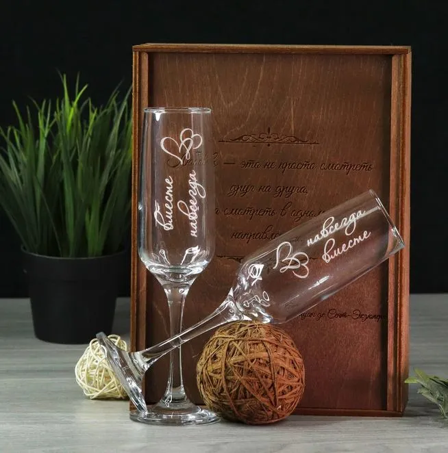 Свадебные бокалы пригодятся не только на свадьбе: любящие супруги смогут их использовать и потом для совместного распития шампанского. Такой подарок легко сделать уникальным, выгравировав на бокалах какую-нибудь надпись.