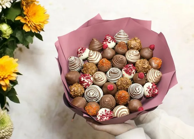 Букет из клубники в шоколаде – хорошая альтернатива обычному цветочному букету. Он не просто красивый, но и вкусный!