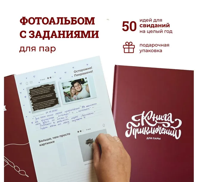 Лучший подарок – это, как известно, книга. А фотокнига – это еще лучше. В отличие от фотоальбома она содержит также текст, ее можно рассматривать и изучать часами. Ты можешь посвятить фотокнигу жизни подруги, вашей дружбе или лав-стори с женихом. Нам понравилась книга приключений для пары: новобрачные могут заполнять ее в течение долгого времени. В книге содержится 50 идей необычных свиданий сюрпризов: нужно стереть защитный слой,прочитать задание, выполнить его, а затем вклеить в альбом фото и рассказать о своих впечатлениях